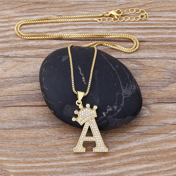 Un collier avec initial de prénom pour bébé fille avec la lettre A et au-dessus de la lettre une couronne, le collier en maillon est de couleur dorée et la lettre a et des strass,