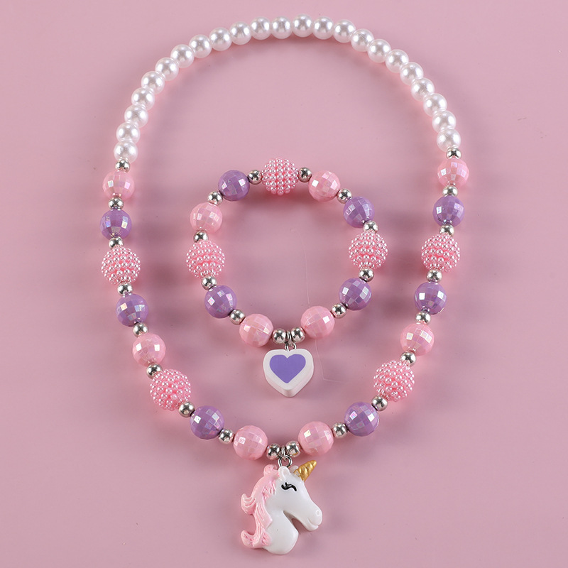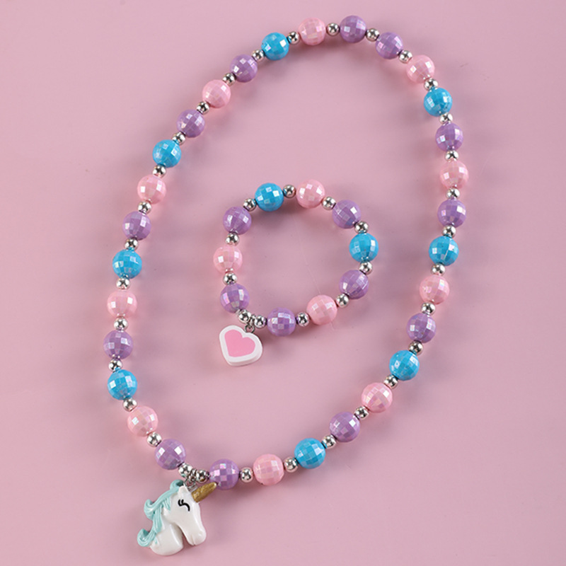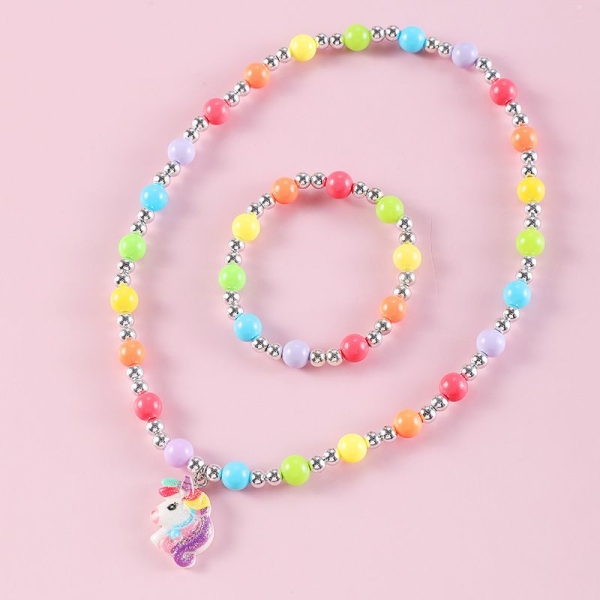Le collier en perle colorée est doté d’une chaîne élastique délicate en plastique avec un pendentif licorne. Le bracelet assorti est également en perle colorée. Les bijoux sont fabriqués avec des perles de qualité pour garantir leur durabilité.