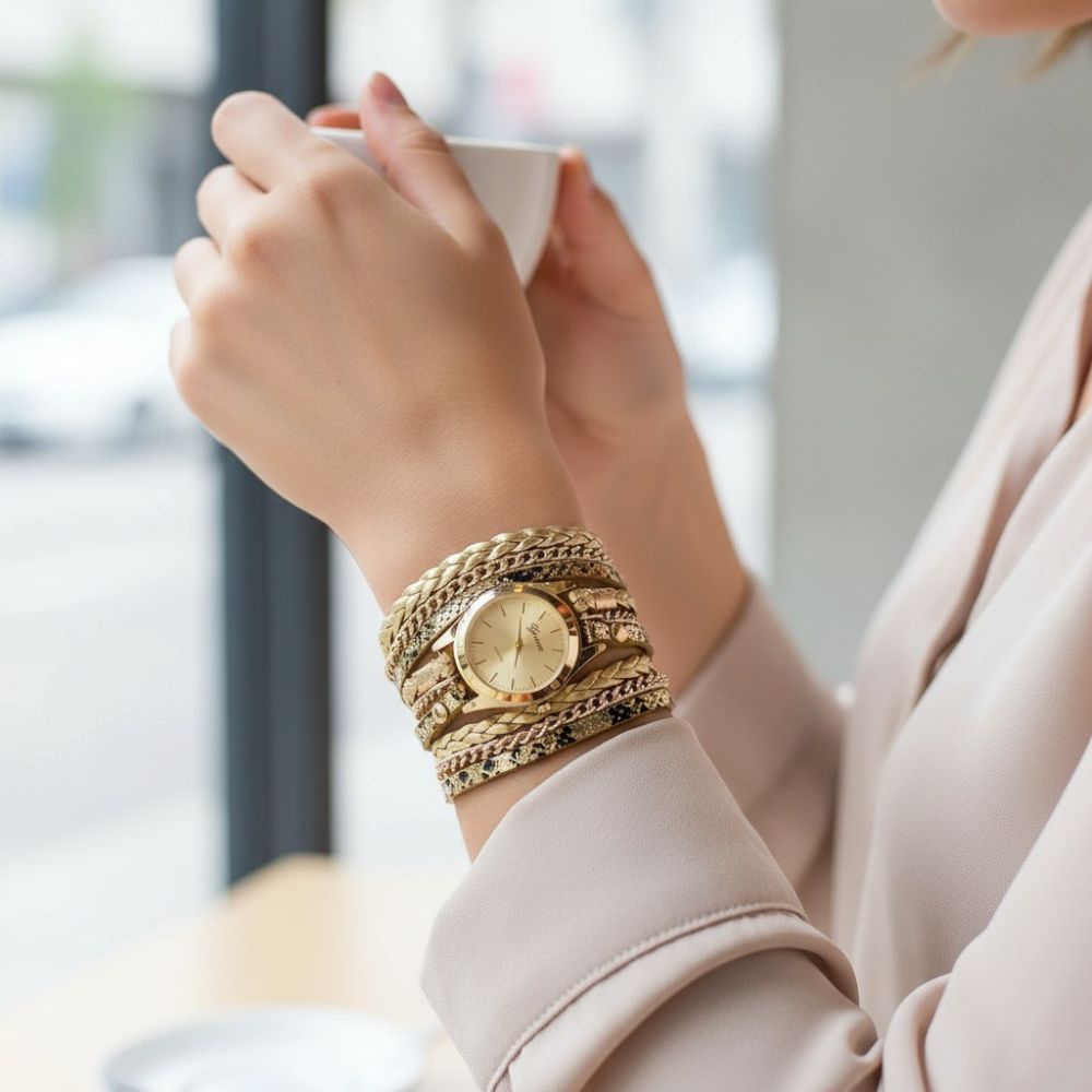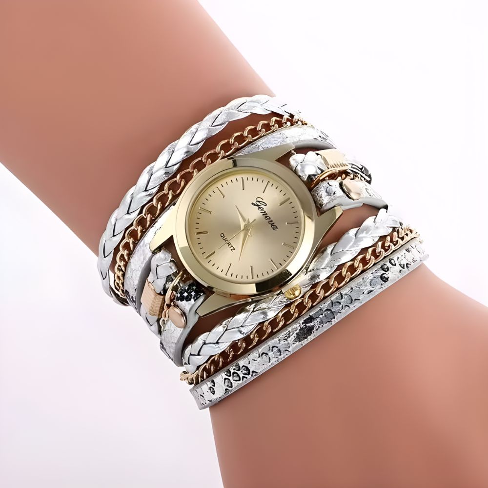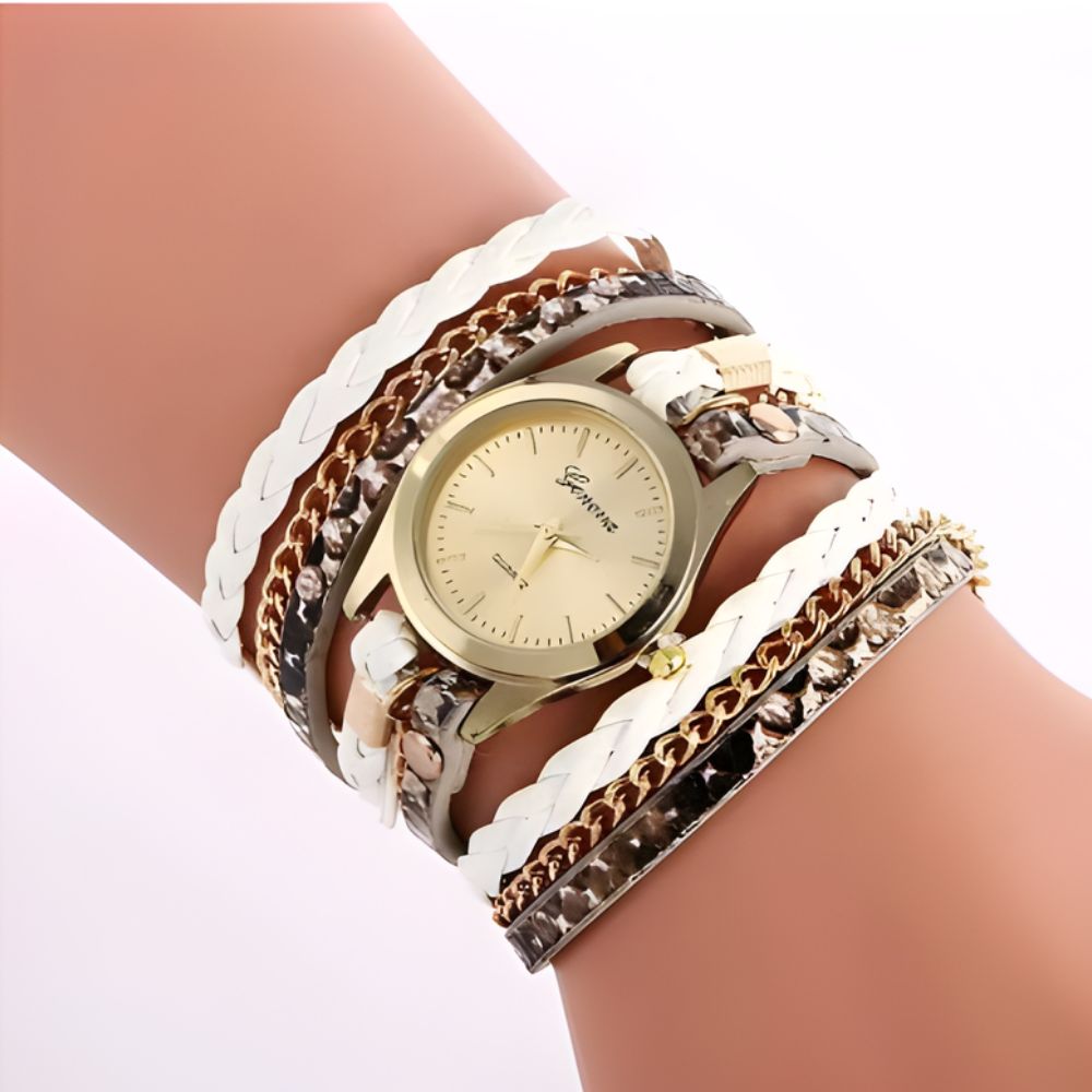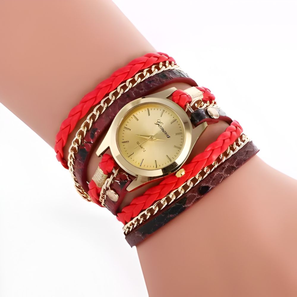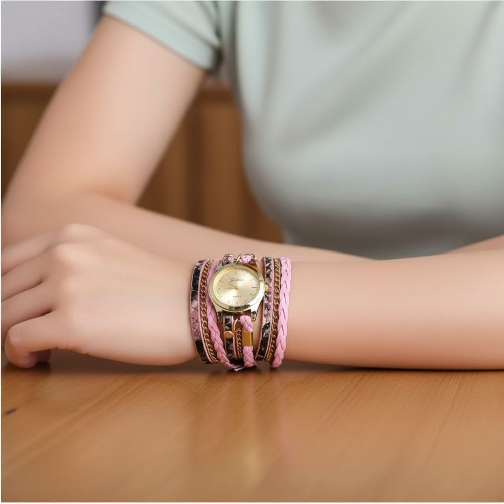 Ajoutez une touche de style unique avec cette montre fantaisie style bohème pour fille. Colorée et élégante, elle combine des bracelets tressés, des clous dorés et une délicate breloque en feuille. Idéale pour toutes les occasions, elle deviendra l’accessoire préféré pour éclairer chaque tenue avec charme et originalité.