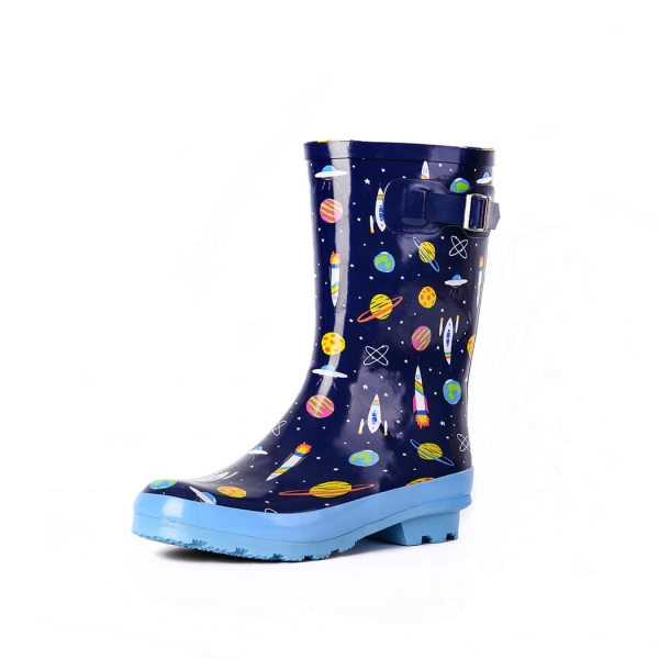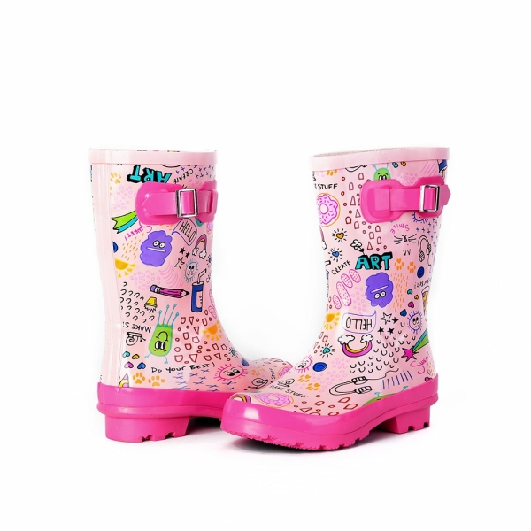 Ces bottes de pluie en caoutchouc sont parfaites pour garder les pieds de votre petite fille au sec et élégantes à la fois ! La botte bleue présente un motif amusant d’espace sidéral, tandis que la botte rose arbore un motif d’art urbain. La botte blanche est ornée de deux magnifiques arcs-en-ciel qui font office de sangles.