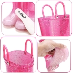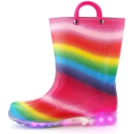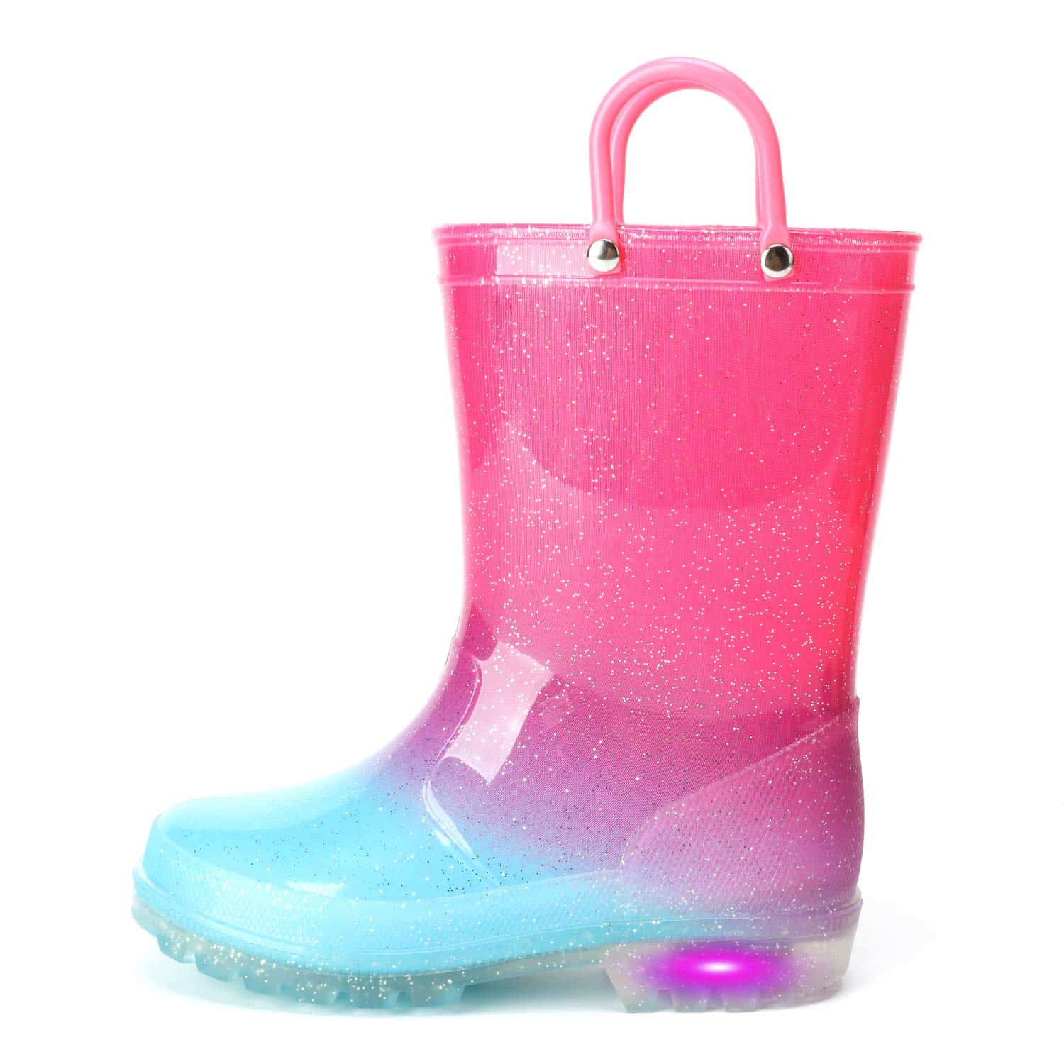 Ces bottes de pluie avec lumière LED pour petites filles sont parfaites pour votre princesse. Ce sont des chaussures en PVC brillant avec un dégradé de rose et un style bling. Les bottes ont un design facile à enfiler et à enlever.