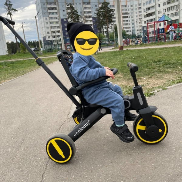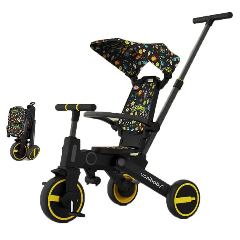 Tricycle noir imprimé jaune de profil, avec une miniature de ce produit plié sur la gauche