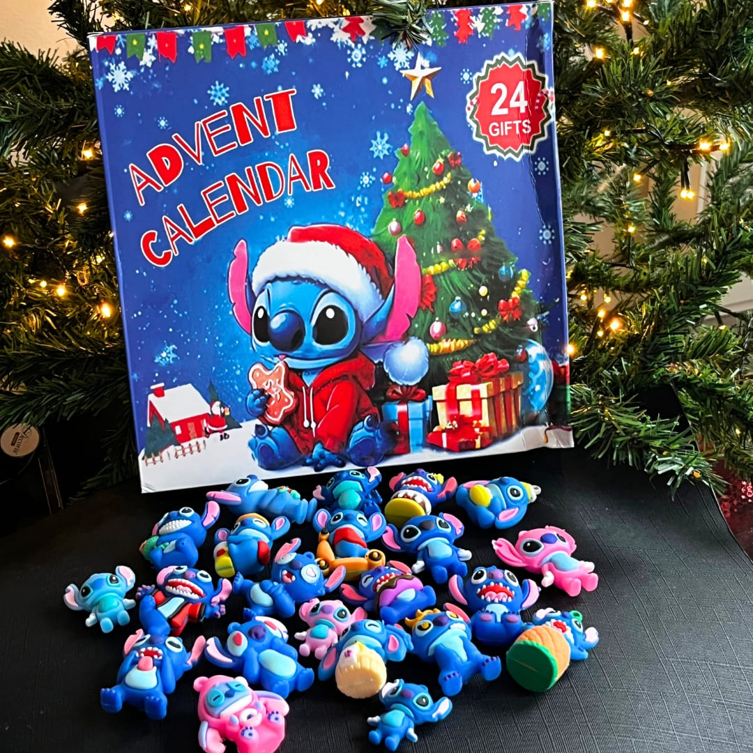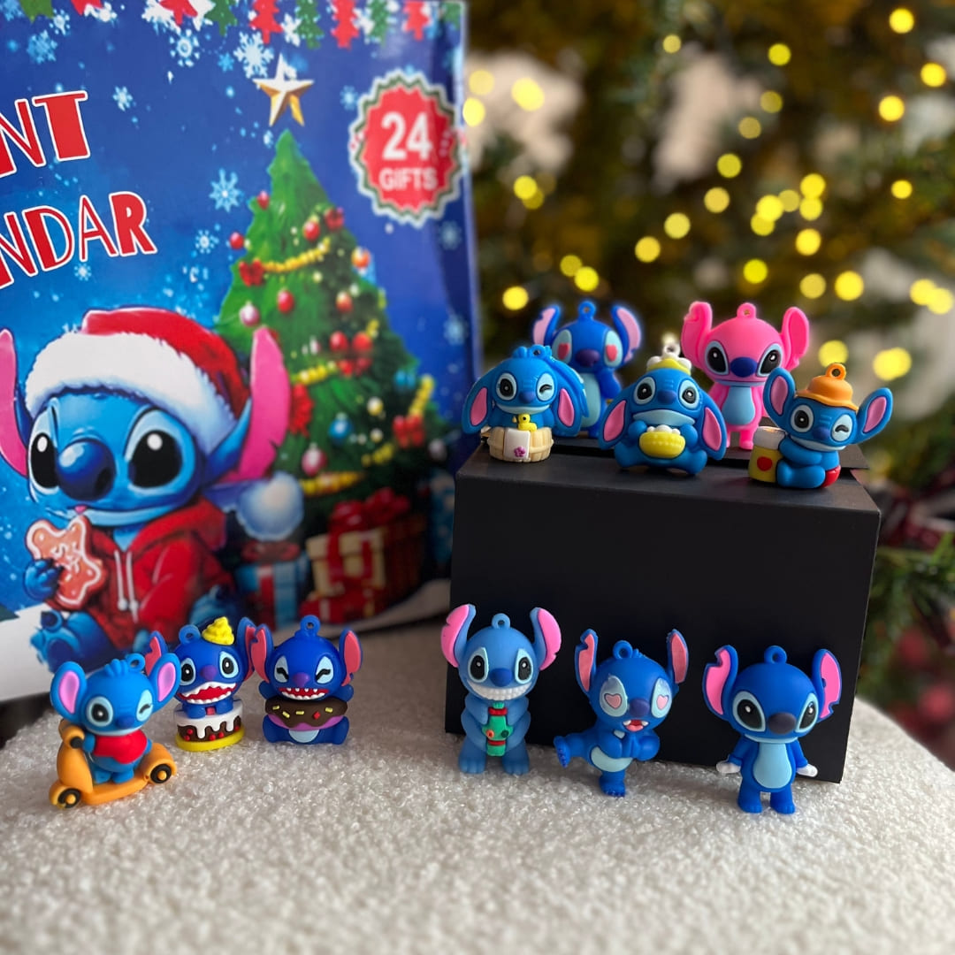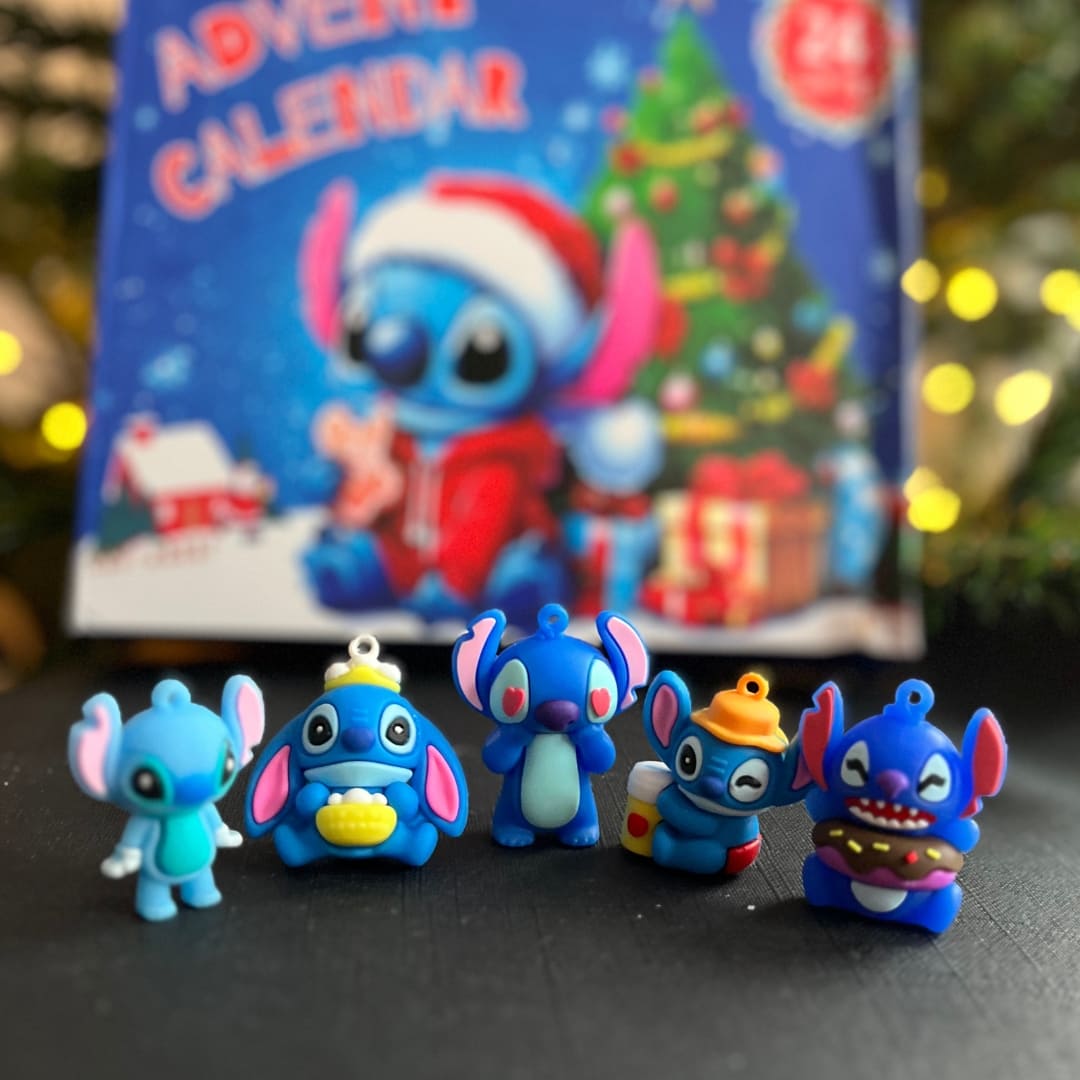 Calendrier de l'Avent Stitch sur fond blanc, avec toutes les figurines disponibles devant la boite