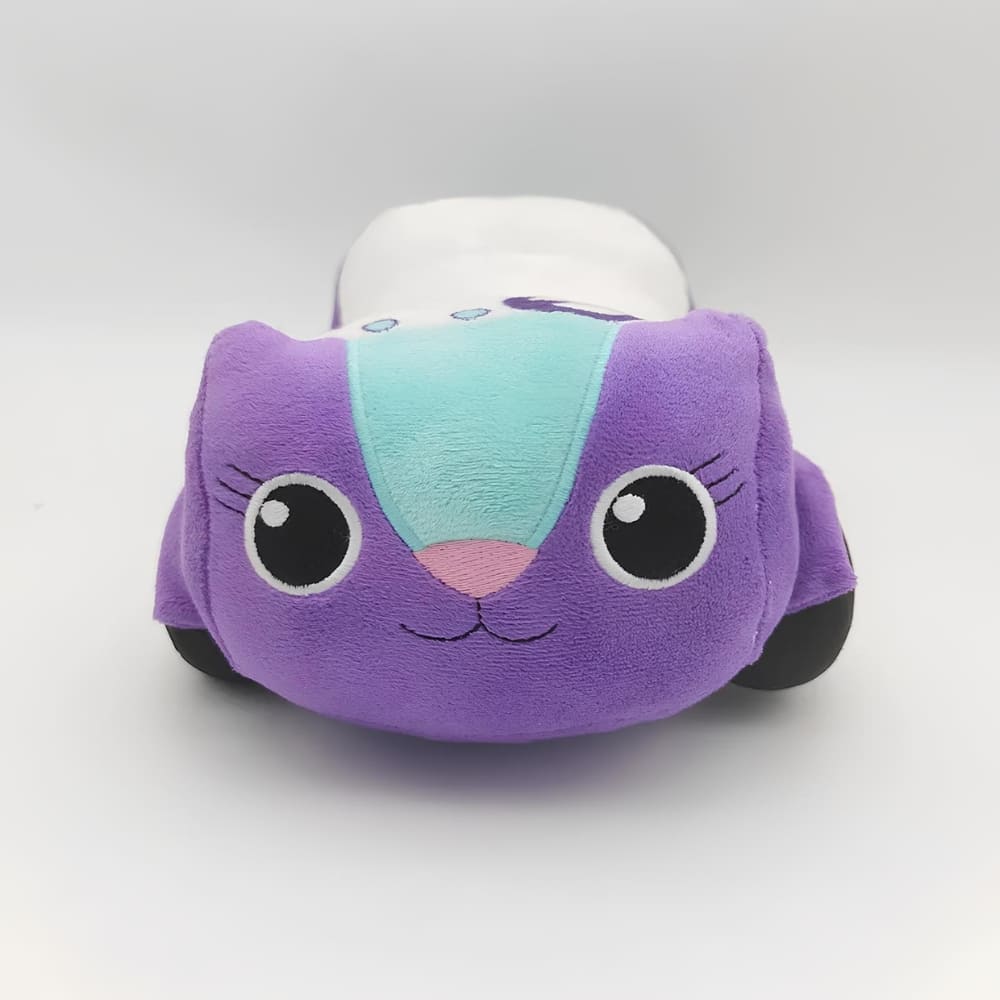 Peluche Gabby Chat doudou Chabriolette, un chat en forme de voiture violette avec une queue rayée sur fond blanc.