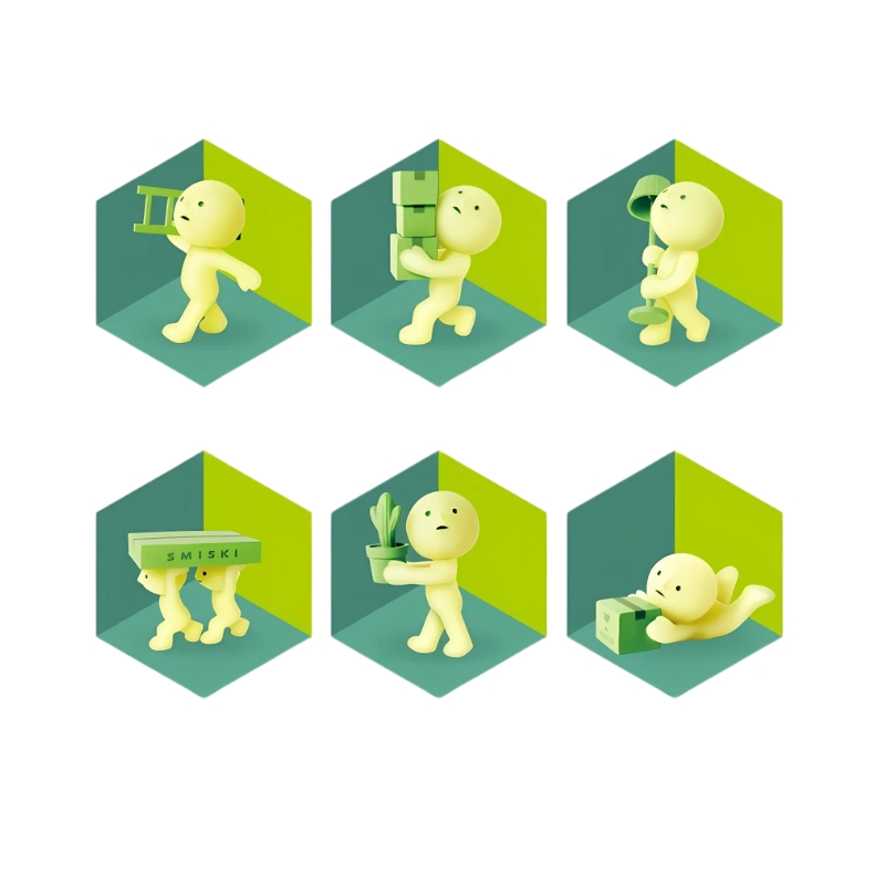 Figurines Smiski Moving, mettant en scène de petites figurines phosphorescentes effectuant des tâches de déménagement, avec des cartons, des plantes et divers objets.