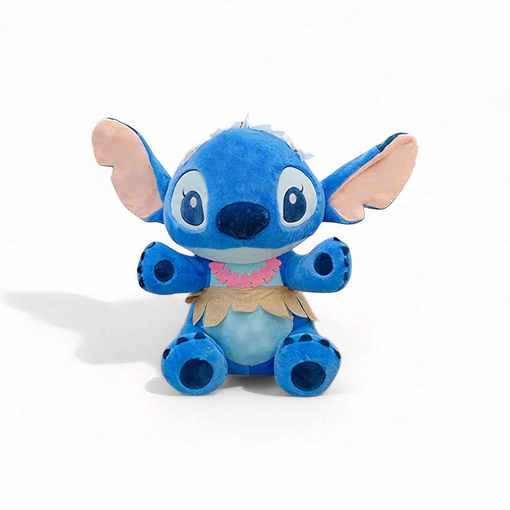 peluche Stitch, habillée d’une jupe hawaïenne beige et d’un collier de fleurs rose, avec de grandes oreilles ouvertes ; sur fond blanc.