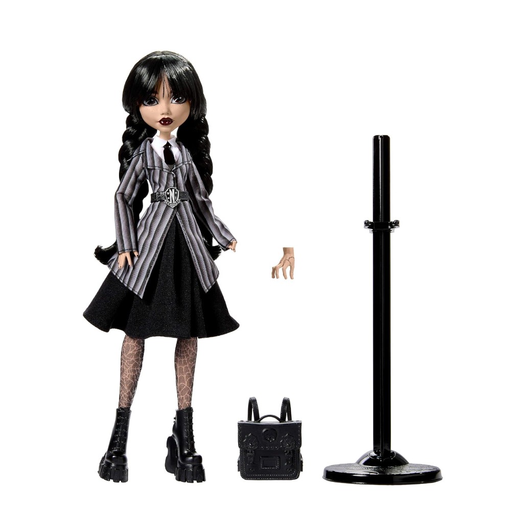 Avec sa veste rayée, sa jupe noire et ses bottines gothiques, cette poupée Mercredi Addams en uniforme Nevermore est une réplique fidèle du personnage culte. Ses deux nattes, son regard perçant et son air sérieux sont là pour faire revivre les scènes préférées de la série !