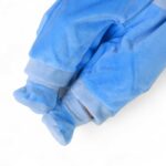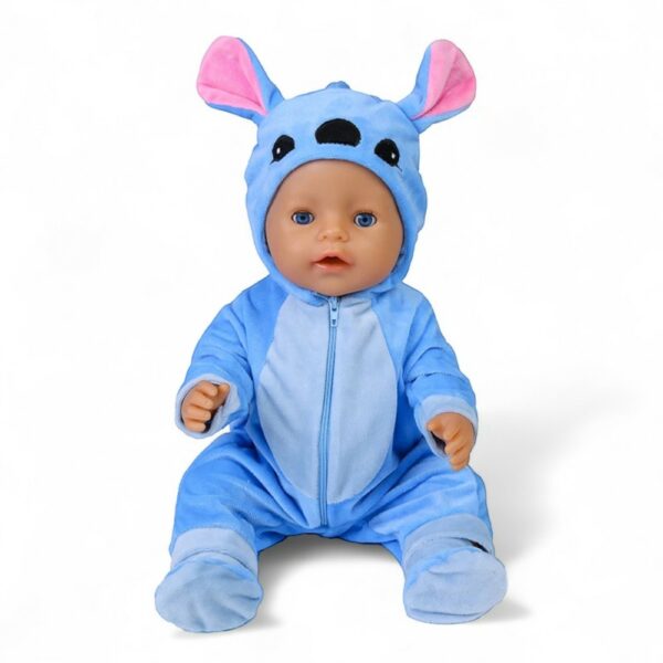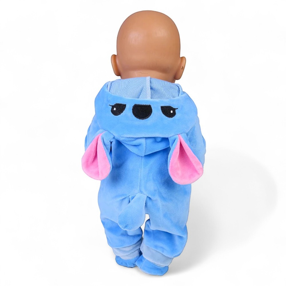 pyjama Stitch bleu ciel pour poupée, capuche avec oreilles roses, porté par un poupon, et présenté vide à coté ; sur fond blanc