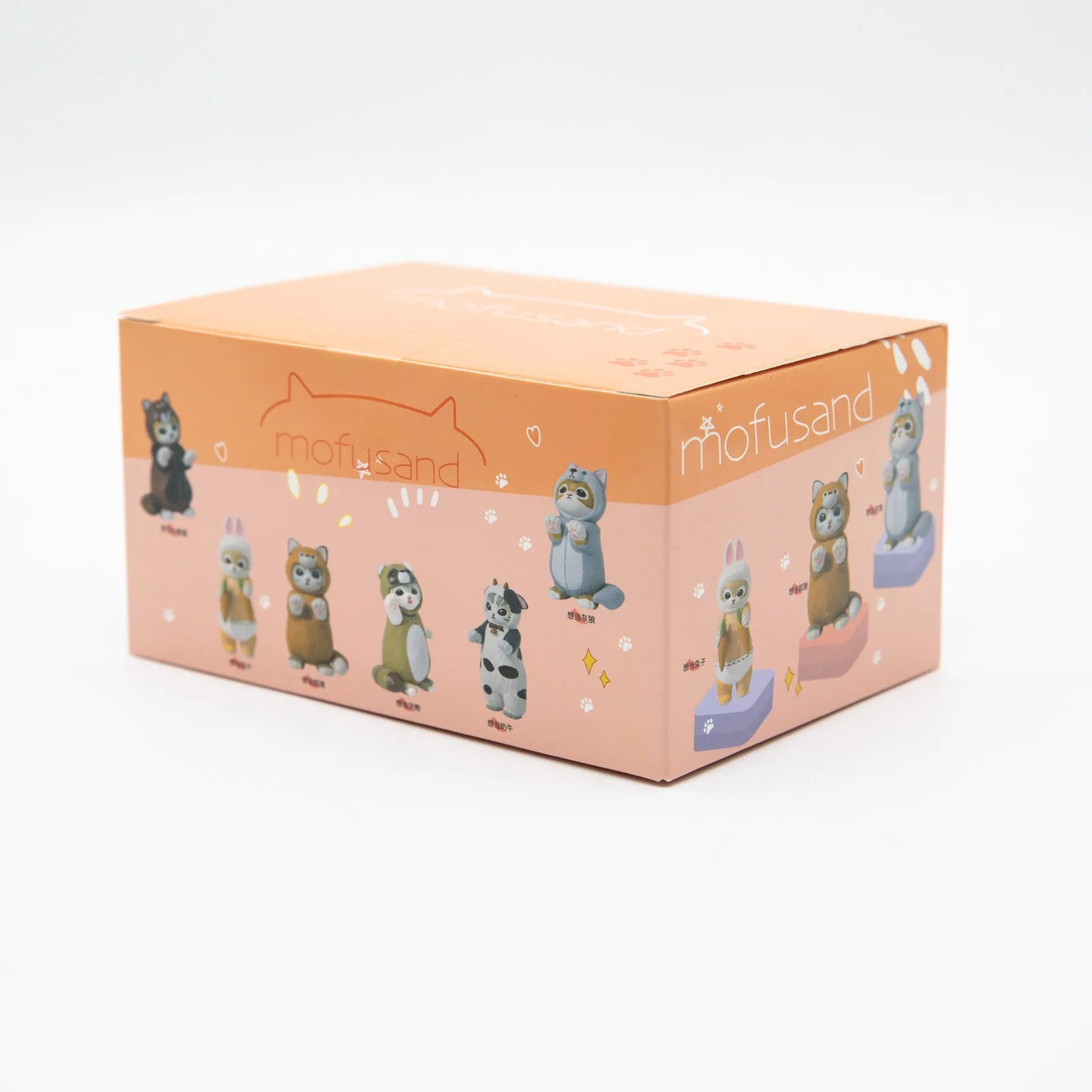Boîte de Blind Box Mofusand avec illustrations de figurines de chats déguisés en animaux kawaii sur fond orange pastel
