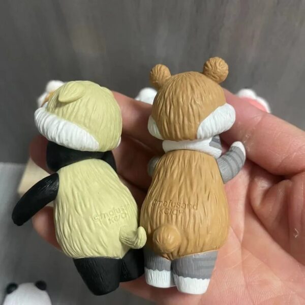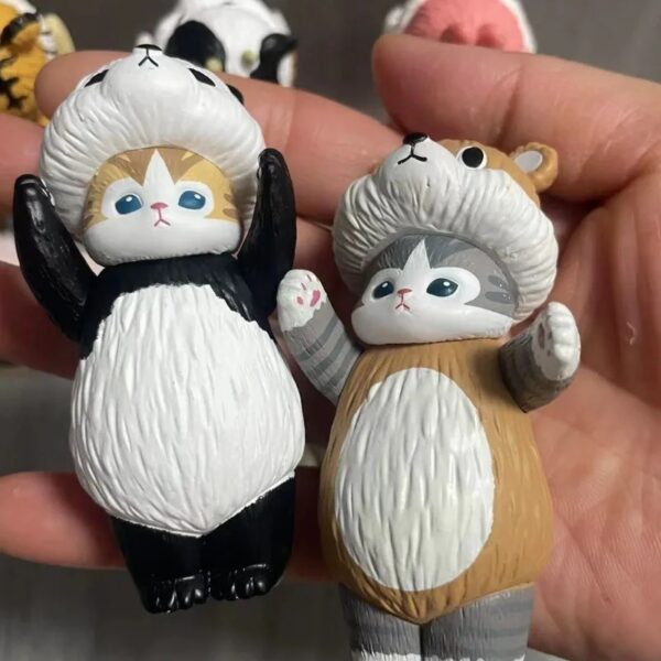 Ffigurines de chats Mofusand, l’une déguisée en panda, l’autre en ourson, tenues à la main avec leurs pattes levées et une expression mignonne.