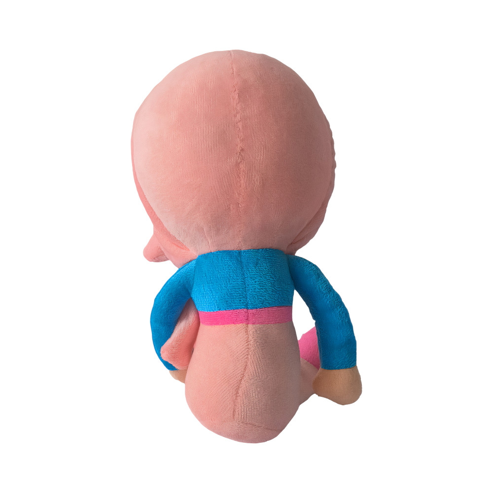 Zari, peluche Duolingo assise sur fond blanc, bras détendus, design coloré de rose et bleu au regard attentif, idéale pour éveiller l’imaginaire sans bruit.