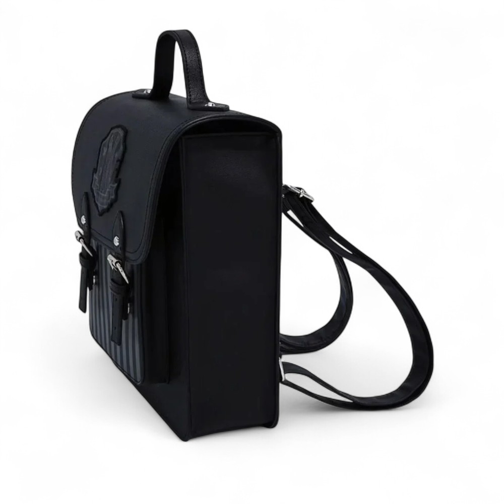 Avec ses rayures verticales noires et grises, ce sac reprend le célèbre motif de l’uniforme de Mercredi. Le rabat est orné d’un écusson brodé de l’académie Nevermore, détail que votre fille reconnaîtra immédiatement.