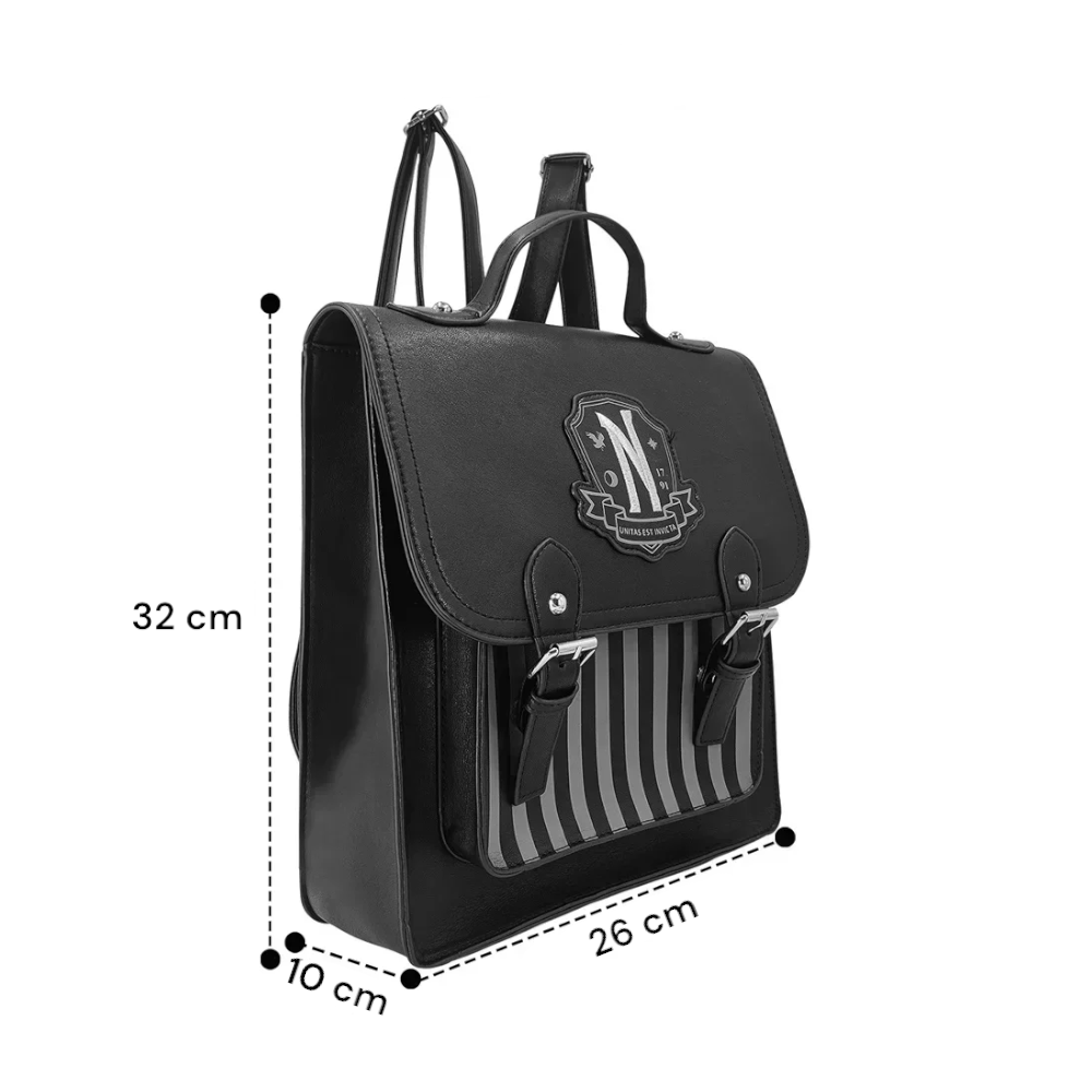Plongez dans l’univers sombre et fascinant de Mercredi Addams avec ce mini sac à dos pensé pour les filles qui aiment avoir des accessoires qui se démarquent des autres.