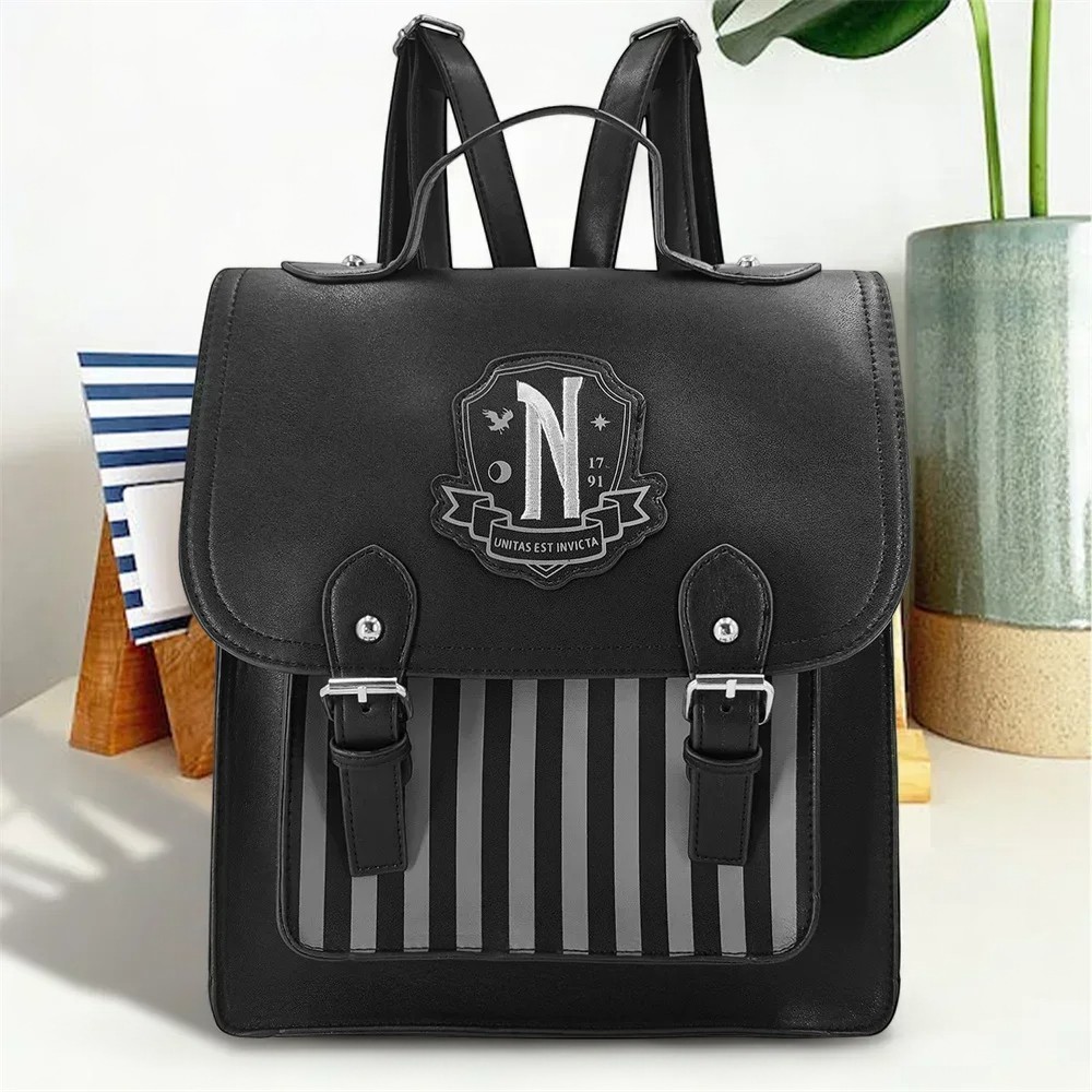Ce mini sac à dos Mercredi Addams noir écusson Nevermore plaît aux filles qui aiment la série ! Rayures sombres, écusson brodé de son école et forme cartable : tout y est. Compact et solide, il est idéal pour transporter ses essentiels avec une touche gothique et tendance.